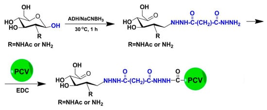 Chitosan oligosaccharides with a high deacetylation degree (HCOS) were prepared from enzymatic hydrolysis as described previously []. In brief, chitosan was dissolved in an acetate buffer, then the pH of the solution was adjusted to 6. The chitosanase from Streptomyces griseus was added to a final concentration of 0.5 μg/mg chitosan, and the reactions were incubated with shaking (500 rpm) at 40 °C. The reaction was stopped by decreasing the pH to 2.5 with HCl. Then, HCOS was acetylated to prepare chitin oligosaccharides (NACOS) and chitosan oligosaccharides with a low deacetylation degree (LCOS) according to the method reported by Li’s group []. The component information of three COSs were determined by TOF-MS, and average molecular weights were determined to be below 1 kDa by HPLC using Evaporative Light-scattering Detector (ELSD) detection on a TSKgel G4000PWXL (Tosoh Corporation, Tokyo, Japan) column (7.8 mm × 300 mm), with 1 k, 5 k and 25 kDa dextran as standards (Supplementary Figures S1–S3). Their deacetylation degrees were also separately identified to be 4%, 60% and 88% by 1H-NMR spectroscopy [] (Supplementary Figure S4). To prepare the conjugates, the reducing ends of COSs were derived with adipic acid dihydrazide by using reductive amination as previously reported [], followed by conjugation to PCV (Figure 1).