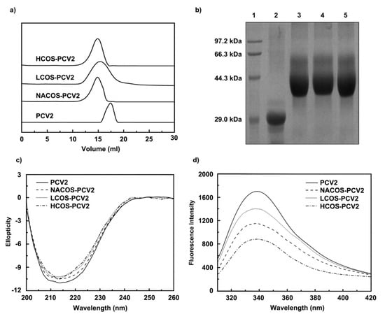 Next, a Superdex 75 column (2.6 cm × 70 cm) was used to purify the free and conjugated PCV2 from the reaction mixture, and the corresponding fractions were collected. After purification, the fraction samples were assayed on an analytical Superdex 75 column (1.0 cm × 30 cm). As shown in Figure 2a, free PCV2 was eluted as a single peak at 17.2 mL, while all three peaks of COS-PCV2 conjugates shifted toward the left, and the elution volumes were 14.9 mL for NACOS-PCV2, 15.0 mL for HCOS-PCV2 and 15.3 mL for LCOS-PCV2, respectively. Furthermore, the purified PCV2 conjugates were analyzed by SDS-polyacrylamide gel electrophoresis (PAGE), showing strong smear bands with a higher mass compared to that of free PCV2 (Figure 2b). In addition, a higher carbohydrate/protein ratio (w/w) was observed for HCOS-PCV2 (0.138) than those of NACOS-PCV2 (0.126) and LCOS-PCV2 (0.127), indicating a more efficient conjugation. A low residual level of unconjugated carbohydrate for each reaction mixture was detected after the purification process, ranging from 2.0 to 4.5%.