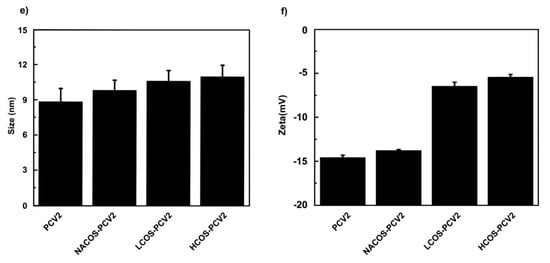 As measured by DLS, free PCV2 exhibited a molecular radius of 8.83 nm, which was lower than those of NACOS-PCV2 (9.82 nm), LCOS-PCV2 (10.62 nm) and HCOS-PCV2 (11.01 nm) (Figure 2e). From the result, it can be presumed that the molecular volume of PCV2 might be increased by COS conjugation.