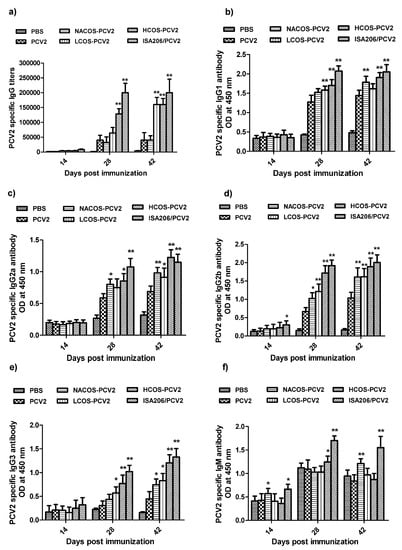 PCV2-specific antibody levels of IgG, IgG isotypes and IgM in mouse serum were assessed by ELISA. As shown in Figure 3a–f, relatively low antibody levels were produced over the whole vaccination period in groups administered by PBS and PCV2. In contrast, the conjugation of PCV2 with NACOS, LCOS and HCOS significantly increased PCV2-specific antibody titers, including IgG, IgG1, IgG2a, IgG2b and IgG3 (p < 0.05 or 0.01, vs. the PCV2 group). In particular, about a four-fold increase in the PCV2-specific IgG antibody was detected in the groups with LCOS-PCV2 or HCOS-PCV2 administration at the third immunization, slightly lower than that of the ISA206/PCV2 group.