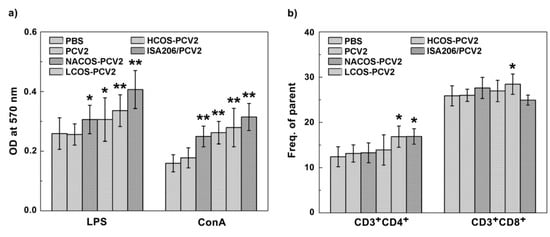 T and B-lymphocyte proliferation can be separately activated by ConA or LPS. To determine whether the lymphocyte proliferation response to PCV2 vaccination was boosted by COS conjugation, the primary lymphocytes from mouse spleens were isolated at 42 dpi and the proliferation assay was assessed by Methylthiazolyldiphenyl-tetrazolium bromide (MTT) analysis. As indicated in Figure 4a, the COS conjugation with PCV2 led to a significant increase in B-cell proliferation after LPS (10 μg/mL) stimulation for 48 h compared with that of the PCV2 group (p < 0.05 or 0.01). The HCOS-PCV2 group showed the highest proliferation activity, but less than that of the ISA206/PCV2 group. Similar results were also observed in T-cell proliferation test after the lymphocytes were stimulated by ConA (2 μg/mL) for 48 h.