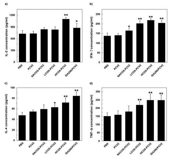 As shown in Figure 5, the levels of cytokines above four from groups with LCOS-PCV2 or HCOS-PCV2 vaccination were statistically higher than that of the PCV2 group (p < 0.05 or 0.01). Notably, the stimulant effect by HCOS-PCV2 on the secretion of IL-2 and IFN-γ were even stronger than that by ISA206/PCV2 (p < 0.05). The result indicates that COS conjugation can promote cytokine secretion initiated by PCV2, which is positively correlated with the deacetylation degree.