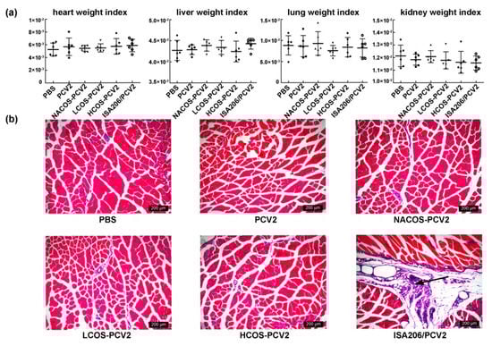 Effect of COS conjugation on the viscera index and injection site in PCV2-vaccinated mice. At 42 dpi, heart, lung, liver or kidneys of the mice were immediately separated and viscera indexes for them were calculated (a), and the tibialis muscle tissues near injection sites were collected for pathological examination by hematoxylin and eosin (HE)-staining (b). Solid arrows represented the inflammatory cell infiltration. Magnification: 100×.