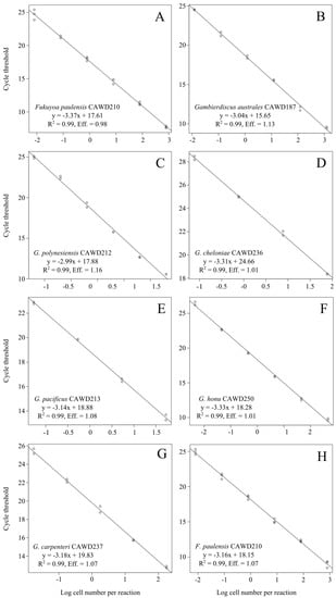 Standard curves for the Gambierdiscus/Fukuyoa QPCR assay (A–G) and Fukuyoa paulensis QPCR assay (H) constructed with 10-fold serial dilutions of genomic DNA extracts from cultures of available Gambierdiscus and Fukuyoa species.