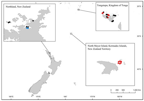 Map of samples sites in New Zealand and the Kingdom of Tonga that were analyzed using the QPCR assays and HTS metabarcoding. Black circles indicate samples that were negative for both QPCR assays, red circles indicate samples that were positive for the Gambierdiscus/Fukuyoa genus QPCR assay, and blue circles indicate samples that were positive for the Fukuyoa paulensis.