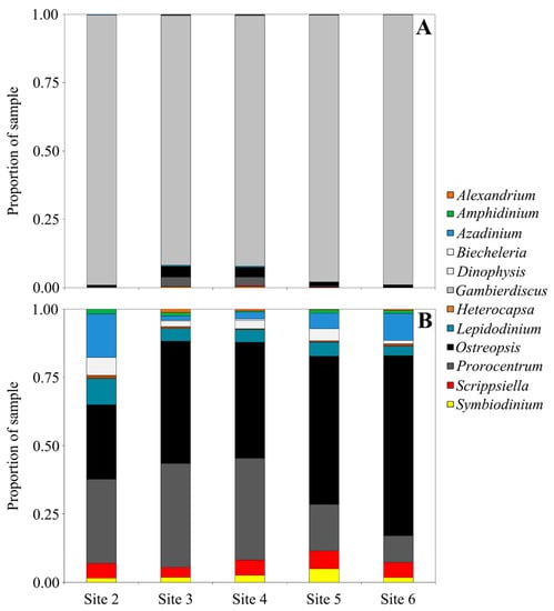 Relative abundance of Dinophyceae reads at genus level from each sampling location at North Meyer Island (Kermadec Islands, New Zealand). (A) Includes reads from all genera and (B) excludes reads identified as Gambierdiscus species.