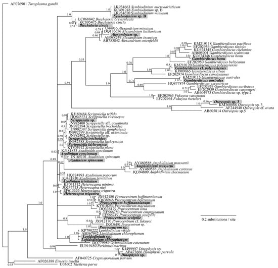 - Kretzschmar, A.L.; Verma, A.; Harwood, T.; Hoppenrath, M.; Murray, S. Characterization of Gambierdiscus lapillus sp. nov. (Gonyaulacales, Dinophyceae): A new toxic dinoflagellate from the Great Barrier Reef (Australia). J. Phycol. 2017, 53, 283–297. [Google Scholar] [CrossRef] [PubMed]