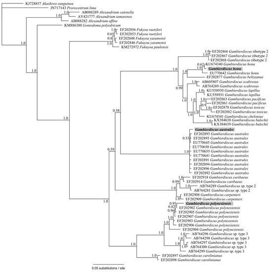 Phylogenetic analysis of partial small subunit ribosomal RNA SSU (V4 region) reads identified as Gambierdiscus species obtained from the HTS metabarcoding using Bayesian analyses. Sequences in bold represent the consensus sequence from all reads of each taxonomic assignment. Values at nodes represent Bayesian posterior probability support. Scale bar is substitutions per site.