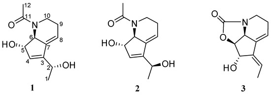 Research conducted over the past several decades in marine microorganisms has clearly indicated that the ocean is a great resource of microorganisms for producing structurally diverse and biologically active secondary metabolites due to their unique environment [1]. Among all known microbes, the filamentous bacteria in the order Actinomycetales are considered as the most prolific source for producing secondary metabolites [2,3,4], consisting of unusual polyketides, nonribosomal peptides, terpenoids, alkaloids, lipids and others. For instance, marinomycins A–D were isolated from a marine sediment culture of Marinispora sp. CNQ-140 showing significant antibacterial activities against drug-resistant pathogens, and selective cancer cell cytotoxicities against six melanoma cell lines [5]. Lajollamycins, a family of nitro group-bearing spiro-β-lactone-γ-lactams were produced by a marine-derived Streptomyces sp. [6]. Salinosporamide, a potent proteasome inhibitor with an unusal β-lactone moiety isolated from a marine Salinospora tropica has been entered human clinical trial for the treatment of multiple myeloma [7]. In our search for new bioactive compounds from marine microorganisms, we isolated actinomycete strains from a marine sediment sample in the Coast of Hainan Island of China. During the screening, we found one of the isolated strains, NA02069, was designated as Streptomyces chartreusis based on its 16s rDNA sequence. S. chartreusis has been previously reported to produce chartreusin, chrymutasins, and calcimycin [8,9], all of which belong to the family of polyketides. In order to enrich the diversity of the compounds from this strain, we became interested in S. chartreusis NA02069 to find whether different compounds can be produced. In this study, we report the isolation and structure elucidation of two new (1) and (2) and a known (3) alkaloid compounds (Figure 1). Compounds 1 and 2 were evaluated for their antimicrobial and acetylcholinesterase inhibitory activities.