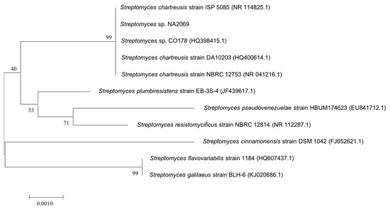 The 16s rDNA sequence of strain NA02069 was amplified by polymerase chain reaction (PCR) and sequenced. After alignment analysis using Basic Logic Alignment Search Tool (BLAST), strain NA02069 showed 100% identities (1352 bp) to a subclade, which also included the type strains of Streptomyces chartreusis ISP 5085, S. chartreusis DA10203, and S. chartreusis NBRC 12753 (Figure 2). Thus, the strain was assgined as Streptomyces chartreusis NA02069 [10].