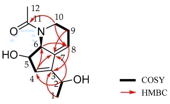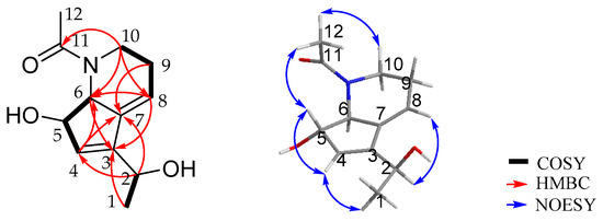 Strepchazolin A (1) was obtained as a pale yellow crystal. Its molecular formula was determined as C12H17NO3 on the basis of the sodium-adduct high-resolution ESIMS ion at m/z 246.1116 [M + Na]+, (calcd for C12H17NO3Na, 246.1101) along with the 13C NMR data (Table 1). The 1H NMR spectrum of 1 in methanol-d4 displayed two double-bond protons (δH 5.85 and 6.05), three oxygen/nitrogen substituted methine protons (δH 4.51, 4.56, and 4.31), four methylene protons (δH 3.16, 3.83, 2.30 and 2.30), and six methyl protons in two methyl groups (δH 1.38 and 2.19). The 13C NMR spectrum showed one carbonyl carbon (δC 175.4), four resonances in the double bond region (δC 148.5, 140.7, 130.3, and 117.8), three oxygen/nitrogen substituted carbons (δC 81.0, 68.4, and 64.7), and four sp3-hybrized quaternary carbons (δC 46.2, 25.8, 22.8, and 22.6). Further analysis of its HSQC spectrum assigned all signals for 1H-13C one bond correlations. The 1H-1H COSY spectrum of H-1 (δH 1.38)/H-2 (δH 4.51); H-4 (δH 5.85)/H-5 (δH 4.56)/H-6 (δH 4.31); and H-8 (δH 6.05)/H-9 (δH 2.30)/H-10 (δH 3.16 and 3.83) revealed three spin systems are present in 1 (Figure 3). The HMBC correlations of H-1/C-3, H-2/C-4, H-6/C-8, H-9/C-7 suggested the above three spin systems were connected through C-2-C-3-C-4, and C-6-C-7-C-8, respectively. Moreover, the HMBC correlations of H-2/C-7, H-4/C-7, as well as H-8/C-3 revealed the connectivity between C-3-C-7, revealing the presence of a cyclopentene moiety. The HMBC correlations of H-6/C-8 and H-10/C-8 together with their typical nitrogen substituted chemical shifts for δC-6 68.4/δH-6 4.31 and δC-10 46.2/δH-10a 3.83 and δH-10b 3.16 indicated the presence of a tetrahydropyridine moiety. Finally, the HMBC correlation of H-10 and H-12 with carbonyl carbon C-11 revealing that an acetyl group was anchored at the N-atom. The remaining two hydroxyl groups were connected at C-2 (δC 64.7) and C-5 (δC 81.0) on the basis of their chemical shifts. Thus, the planar structure of 1 was established.