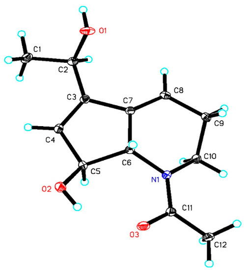 Compound 1: Pale yellow crystal; [α] D 25 −68° (c 0.10, MeOH); m.p.: 125–126 °C; UV (MeOH) λmax (log ε): 217 (0.791), 281 (0.391) nm. HR-ESI-MS (m/z): 246.1116 [M + Na]+ (calcd. for C12H17NO3Na, 246.1101); 1H and 13C NMR data are listed in Table 1.