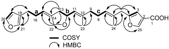 The molecular formula of compound 1 was determined as C25H30O5 by observing its sodiated ion at m/z 433.19909 (∆ + 1.2 ppm). As eight out of eleven degrees of unsaturation can be accounted for by the presence of one carbonyl (1715 cm−1, δC 167.0 s) and seven double bonds (14 signals in the range from δC 156.4 to 106.0), the molecule was determined to contain three rings. Of the double bonds, two were incorporated into a β-substituted furan (δH 7.34 brs, 7.21 brs, 6.26 brs; δC 142.7 d, 138.9 d, 124.5 s, 110.9 d), while another two were assigned to a disubstituted furan moiety (δH 7.96 brs, 6.38 brs; δC 156.4 s, 147.7 d, 119.0 s, 106.0 d) after NMR inspection (Figures S1 and S2). Using 2D NMR (Figures S3–S5) analyses, three other double bonds were involved in the following three substructures: (a) –CH2–CH2–CH=C< (δH 5.33 m; δC 139.8 s, 119.2 d), (b) –CH2–CH(O–)–CH=C< (δH 5.24 m; δC 139.7 s, 124.9 d), and (c) –CH2–CH2–CH=C< (δH 5.24 m; δC 130.9 s, 127.2 d) (Figure 1). The remaining pieces of the molecule were an oxymethylene (δH 4.39 d, 4.20 d; δC 68.3), an sp3 hybridized methylene (δH 3.28 s; δC 38.1), and two vinyl methyls (δH 1.70 brs, 1.60 brs; δcC 16.7, 15.9).