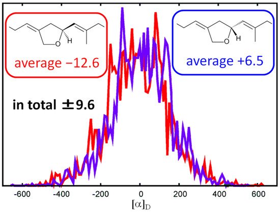 We first performed the MD simulation to sample various conformations of compound 1 in CH2Cl2 solution. The system consisted of one compound 1 and 3375 CH2Cl2 molecules. A cubic unit cell with the periodic boundary condition was employed, using a box length of 72.5 Å. The general Amber force field (GAFF) [19] was used for compound 1 and CH2Cl2. Long-range electrostatic interactions were treated with the particle mesh Ewald method. Bonds involving hydrogen were constrained by using the SHAKE method. The equations of motion were integrated using the leapfrog algorithm with a time step of 1 fs at a temperature of 300 K. The MD simulation was performed for 500 ns. Next, 5000 geometries of compound 1 taken from the MD trajectory were optimized with the DFT method at the IEFPCM(CH2Cl2)/B3LYP/6-31G(d) level. Finally, specific rotation values were calculated with the TDDFT method at the IEFPCM(CH2Cl2)/B3LYP/aug-cc-pVDZ level [20]. We performed this procedure for both 12S and 12R configurations. The distributions of specific rotation values for (12S)-1 and (12R)-1 were almost antisymmetric (Figure 1), indicating that the number of samples was sufficient. The specific rotation values averaged over 5000 samples were −12.6 and +6.5 for (12S)-1 and (12R)-1, respectively. Further averaging the values over the two configurations, the values of (12S)-1 and (12R)-1 were −9.6 and +9.6, respectively. The MD simulations and TDDFT calculations were performed using the AMBER 12 [21] and Gaussian 09 [22] program packages at the Research Center for Computational Science, Okazaki, Japan.