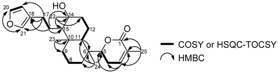 By analyzing the HMBC correlations from three singlet methyls at δH 1.18 (H-22), 1.03 (H-23), and 0.87 (H-24), it was straightforward to construct a partial structure starting from C-24 via C-6,7,11,10,9,15,14,13 to C-22. The two remaining methylenes at C-8 (δC 17.4) and C-12 (δC 17.5) were involved in the bicyclic portion by Heteronuclear Single Quantum Correlation-Total Correlation Spectroscopy (HSQC-TOCSY, Figure S12) correlations (H-7α C-8,9, H-11/C-12,13). Therefore, the decaline ring was confirmed. Two allylic methylene protons at δH 2.44 and 2.39 (H-17a,17b) were assigned next to the furan by observing HMBC correlations to furan carbons (H-17a,17b/C-18,19,21) and another methylene at C-16 (H-16/C-14,15,17,18). Since the δ-lactone moiety was confirmed to be attached to C-6 by observing an HMBC cross peak (H-24/C-5), the whole planar structure of compound 2 was determined, as depicted in Figure 4.