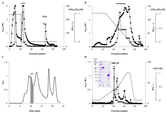 From the powdered sample of H. renshii, lectin was extracted with 20 mM phosphate buffer (pH 7.0) (PB) containing 0.85% NaCl (PBS) and effectively recovered as a precipitate with 70% saturation of ammonium sulfate. In hydrophobic chromatography with stepwise elution of ammonium sulfate in PB, lectin was mostly adsorbed onto a HiPrep Phenyl FF column equilibrated with 1 M ammonium sulfate and then eluted with PB (Figure 1A). By re-chromatography of the non-adsorbed fraction, lectin was again recovered as PB-eluate in the same way. Both PB-eluates were combined and subjected to hydrophobic chromatography on the same column with a gradient elution (1.0–0 M) of ammonium sulfate in PB, in which the lectin was adsorbed and then eluted as a broad peak with 0.55–0.15 M ammonium sulfate (Figure 1B). The active peak fraction gave five major peaks in successive gel-filtration on a Superdex-75 column (Figure 1C). A major active peak obtained by gel-filtration was further purified by ion-exchange chromatography on a TSKgel DEAE-5PW column, affording a sharp protein peak with activity (Figure 1D). The purified lectin gave a single protein band of about 40 kDa and 10 kDa in non-reducing and reducing sodium dodecyl sulfate-polyacrylamide gel electrophoresis (SDS-PAGE), respectively (Figure 1D), and used for further experiments. The yield of the lectin, named HRL40 after the algal species H. renschii and its molecular weight, was 1.3 mg from 2 kg of the frozen alga (Table 1).