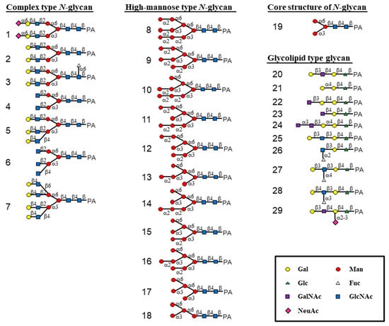 Schematic structures of 29 pyridylaminated (PA)-oligosaccharides used in this study. The selected oligosaccharides represent diverse carbohydrate structures; complex type N-glycans (1–7), high-mannose type N-glycans (8–18), an N-glycan core pentasaccharide (19), and oligosaccharides originated from glycolipid (20–29). Monosaccharide residues of Gal, Man, Glc, Fuc, GalNAc, GlcNAc and NeuAc are represented by symbols as shown in the box.