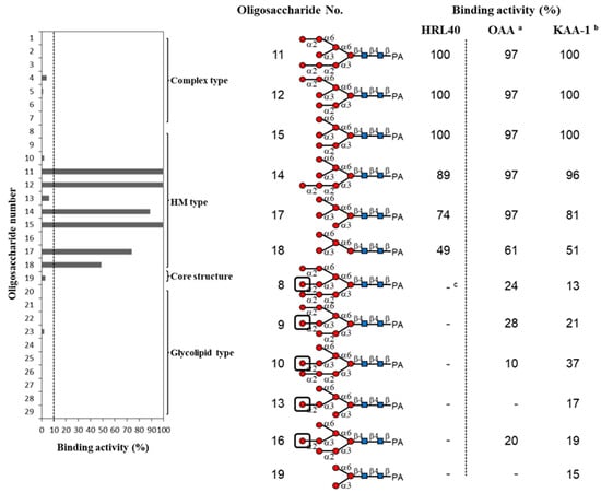 The oligosaccharide-binding property of HRL40 was examined by a centrifugal ultrafiltration-HPLC method [6,28] with a serial of pyridylaminated (PA-) oligosaccharides, including complex type N-glycans (1–7 in Figure 2 and Figure 3), HM-glycans (8–18), an N-glycan core pentasaccharide (19), and oligosaccharides originated from glycolipids (20–29). The schematic structures of oligosaccharides examined are shown in Figure 2. In the assay, the binding activity was expressed as the ratio (%) of the amount of a bound PA-oligosaccharide to that of an added PA-oligosaccharide.