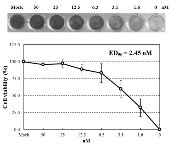 To examine anti-influenza activity of HRL40, infections with an influenza virus A strain A/H3N2/Udorn/72 were performed using human NCI-H292 cells in the presence of serial diluted concentrations of lectin. Under these infections with the virus strain in the absence of the lectins, almost all cells were dead at 24 h post-infection (hpi). Dose-effects of HRL40 on the inhibition of infection were investigated (Figure 4). This lectin was demonstrated to be potently active against the influenza virus. The extent of the infection-inhibition correlated with the increased concentrations of HRL40 in the cultures. The lectin concentration giving 50% inhibition of infection (ED50) was obtained by reading the point at which the curve crossed the 50% line. The ED50 for HRL40 was 2.45 nM (Figure 4), suggesting that this lectin might be a promising antiviral agent for its striking inhibitory ability of virus infection.
