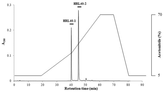 Reverse-phase HPLC of HRL40. Reverse-phase HPLC was performed on a TSKgel ODS-80TM combined with a gradient elution of acetonitrile in 0.05% trifluoroacetic acid (TFA).