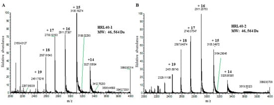 Electrospray ionization-mass spectrometry (ESI-MS) of HRL40-1 (A) and HRL40-2 (B). The molecular weights of both isolectins were obtained as deconvolution masses.