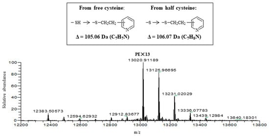 Both isolectins were subjected to alkylation with 4-vinylpyridine in the presence of a reducing agent, tri-n-butylphosphine, and then applied to liquid chromatography (LC)-ESI-MS. As shown in Figure 8, where the result with pyridylethylated (PE-) HRL40-1 is represented, the multiple deconvolution mass of 13,020 Da was observed along with additional larger masses. The mass of 13,020 Da can be attributed to the PE-derivatives at 13 half-cystine residues of a subunit polypeptide (11,641 Da) of the SS-linked tetrameric lectin protein (46,564 Da) because the difference mass of 1379 Da (13,020–11,641 Da) corresponds to 13 times of the increased mass (+106 Da) by the addition of a pyridylethyl group at a reduced half-cystine. On the other hand, the masses larger than 13,020 Da may be derived from pyridylethylation at free cysteine residues where the mass increase by 105 Da each was observed. This estimation was also supported by the comparison of molecular weights of intact HRL40-1 and S-pyridylethylated HRL40-1 in the absence of a reducing agent (Figure S1). Thus, this lectin contained a lot of disulfide bonds in the molecule. HRL40-2 was also analyzed in a similar way and almost the same results were obtained (Figure S2). Thus, the protein structures of HRL40-1 and HRL40-2 appear to be quite different from those of Type I HM-specific algal lectins (the OAA family), which are monomeric proteins and have one or no cysteine residues in the molecule [6,10,15,29].