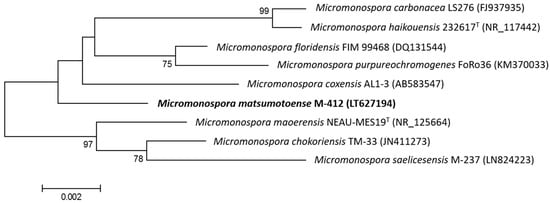 Neighbour-joining phylogenetic tree obtained by distance matrix analysis of 16S rDNA sequences, showing Micromonospora matsumotoense M-412 position and most closely related phylogenetic neighbours. Numbers on branch nodes are bootstrap values (1000 resamplings; only values >70% are given). Bar indicates 0.2% sequence divergence.