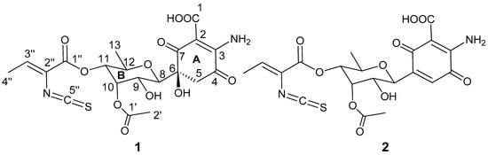 Compound 1 was isolated as a pale yellow solid. LC-UV-HRMS analysis of the isolated sample revealed a purity of 83.5% (UV at 210 nm), and indicated the presence of a major impurity in the sample (16.5%), which was identified as the dehydrated paulomycinone 2 based on its UV and HRMS spectra (see Figures S1, S4 and S5). Dehydration of paulomycins has been described to occur easily, even when leaving the compounds in solution in aqueous media at neutral pH, and is therefore difficult to avoid []. The major compound of the mixture, paulomycin G, had a molecular formula of C20H22N2O11S according to ESI-TOF MS measurements (m/z 499.1015 [M + H]+, calcd. for C20H23N2O11S+, 499.1017) and the presence of 20 signals in its 13C NMR spectrum. Its UV spectrum displayed maxima at 238, 276, and 320 nm, in agreement with a paulomycin-like structure [,]. An intense absorption band at 2041 cm−1 in its IR spectrum confirmed the presence of an isothiocyanate group in the molecule, present in the pauloate moiety of all paulomycins. NMR spectra (Table 1) confirmed the presence of this pauloate moiety, with signals for a methyl group (δH 1.89, δC 14.6 ppm) coupled to an sp2 proton (δH 6.71, δC 136.9 ppm) in the COSY spectrum. HMBC correlations from the latter proton to carbons at δC 159.8 (α,β-unsaturated carbonyl group C1′′), 122.3 ppm (sp2 quaternary carbon C2′′), 141.6 ppm (isothiocyanate carbon C5′′, four-bond distance correlation), and 14.6 ppm (methyl C4′′) completed the structural assignment of the pauloate moiety. Additionally, signals for an aliphatic methylene at δH 3.22 and 3.17 that correlated in the HMBC spectrum with carbon signals at δC 159.4 (C3), 188.8 (C4), 77.5 (C6 and C8), and 197.5 (C7), and the presence of two additional signals at δC 169.0 and 99.1 ppm accounted for the presence in the molecule of the 6-substituted 2-amino-5-hydroxy-3,6-dioxocyclohex-1-enecarboxylic acid substructure present in the paulomycin family of compounds. On the other hand, signals for five oxygenated methines at δH 3.69, 3.61, 5.29, 4.51, and 3.79 ppm, and one aliphatic methyl group at 0.88 ppm conformed a spin system according to COSY correlations that accounted for ring B in the structure of the molecule. Connection between carbon C6 of ring A and carbon C8 in ring B was additionally confirmed via HMBC correlations observed between H8 and C5, C6, and C7. Finally, signals for an acetyl functionality were observed (δH 2.10 ppm, δC 170.1, and 20.8 ppm). This acetyl group was placed at C10 based on HMBC correlations of H2′ and H10 to the carbonyl carbon C1′ and the low field chemical shift of H10. The pauloate moiety was similarly placed at C11 based on an HMBC correlation observed between H11 and C1′′. The relative configuration proposed around the chiral centres in ring B was based on the large coupling constants observed between H8 and H9 (9.8 Hz) and between H11 and H12 (9.9 Hz), indicating the axial orientation of all these protons. The two small coupling constants measured for H10 strongly suggested an equatorial orientation for this proton, and finally, correlations observed in the ROESY spectrum between H10, H9, and H11, and between H8 and H12, proved a relative configuration for ring B as depicted in Figure 2. Based on biogenetic considerations, the absolute configuration was assumed to be the same as in other compounds of the paulomycin series.