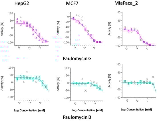 Cytotoxic activity was observed for the compound against human breast adenocarcinoma (MCF-7), pancreatic adenocarcinoma (MiaPaca_2), and hepatocellular carcinoma (HepG2) cell lines (Table 2). Considering the lack of biological activity reported for compounds having the quinone moiety present in compound 2 [], it is reasonable to assume that the biological activity reported herein for the isolated sample is mostly due to paulomycin G. Paulomycin B did not display any cytotoxic activity against the three cell lines when tested in parallel. Figure 3 represents the dose-response curves of paulomycins B and G against the different tumour cell lines.