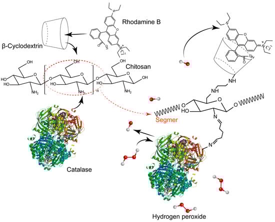 To improve the performance of fluorescent biosensors, attempts have been made to combine the excellent properties of CTS with those of β-CD by modifying CTS with β-CD in biosensor construction. However, most studies have been focused on preparation of CTS-CD by the reaction of cyclodextrin derivatives with the highly active 2-NH2 groups on the chain of chitosan, which is unconducive to the utilization of the biologically active 2-NH2 of CTS. We previously systematically explored the preparation of various CTS-6-CD derivatives. For example, Chen et al. [] immobilized cyclodextrin on the 6-OH of CTS by the nucleophilic substitution method, where the amino group of CTS was pre-protected with phthalic anhydride. The 2-NH2 was then deprotected with hydrazine hydrate. The resultant CTS-6-CD derivative exhibited good solubility with the biological activity of 2-NH2 unaffected. In the present work, we proposed a novel method for the construction of fluorescent H2O2 biosensors with CTS and β-CD. A catalase was immobilized on the 2-NH2 of CTS and the fluorescent probe rhodamine B (RhmB) was encapsulated in the hydrophobic cavity of the cyclodextrin immobilized on the 6-OH of CTS to form a functional membrane CTS-6-CD-RhmB-CAT (Figure 1). It was then used for the H2O2 detection due to the synergistic effect of these two functional groups. Such strategy was able to simplify the detection of H2O2 and the separation of catalase, and increase the stability of RhmB in detection. The oxidation and detection of H2O2 were realized on the same functional membrane.