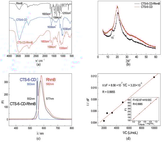 Characterization of CTS-6-CD-RhmB (a) Infrared spectrum of CTS-6-CD-RhmB, CTS-6-CD and RhmB; (b) XRD spectra of CTS-CD-RhmB and CTS-6-CD; (c) Fluorescence spectroscopy of CTS-6-CD-RhmB; (d) I/ΔF vs. 1/C curve and standard curve of inclusion effect of cyclodextrin on RhmB (the inserting figure).