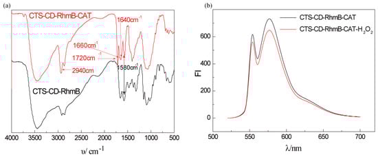 Characterization of CTS-6-CD-RhmB-CAT (a) Infrared spectrum of CTS-6-CD-RhmB-CAT and CTS-6-CD-RhmB; (b) The influence of the addition of H2O2 on fluorescence spectroscopy of CTS-6-CD-RhmB-CAT.
