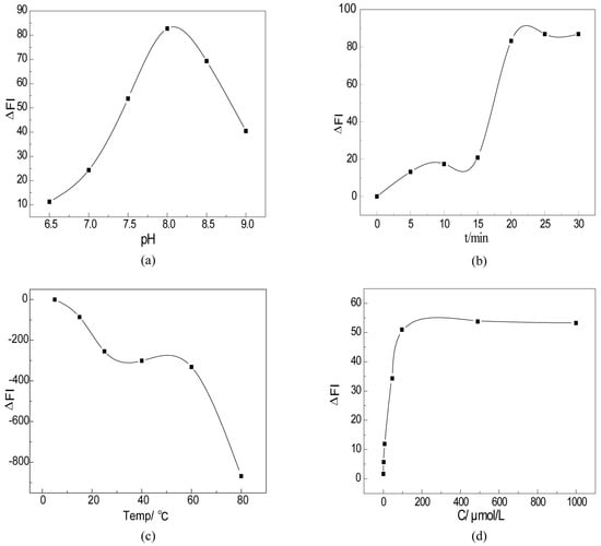 Optimization of H2O2 detection conditions (a) The difference of fluorescence intensity (ΔFI) with the change of pH; (b) ΔFI with the change of TIME; (c) ΔFI with the change of TEMP; (d) ΔFI with the change of enzyme concentration.
