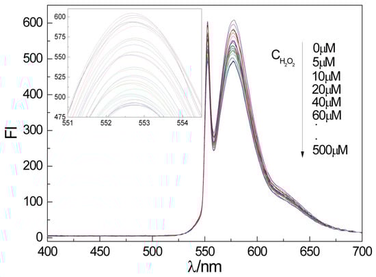Various H2O2 detection techniques, such as spectrophotometry, high performance liquid chromatography, chemiluminescence, fluorescence spectrophotometry, electrochemical analysis, and so on, have been reported [,]. Among them, fluorescent biosensor has been used in a variety of fields, especially on-site H2O2 detection, due to its low cost, convenience, and high sensitivity. Recently, fluorescent H2O2 biosensors have attracted considerable attention. For example, Han [] constructed three novel low cost and highly selective fluorescent H2O2 biosensors with silver nanoclusters and nucleic acid dyes. The biosensors were successfully used for the H2O2 detection in the presence of Fe2+ without any complex modification required.