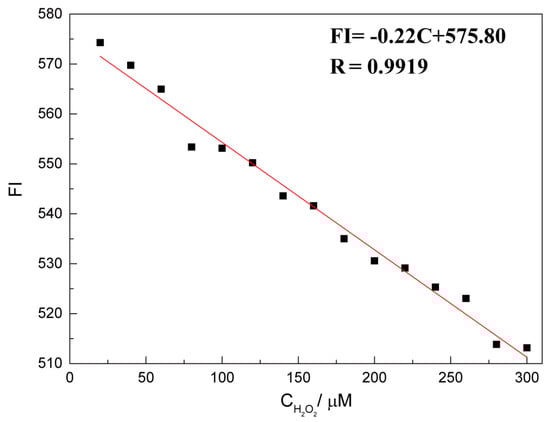 It is clear that the fluorescence intensity of CTS-6-CD-RhmB-CAT was gradually decreased with the increase of H2O2 concentration (Figure 5). CTS-6-CD-RhmB-CAT exhibited a strong fluorescence emission at 552 nm that varied with the change of H2O2 concentration. To more intuitively determine the relationship between fluorescence intensity (FI) and H2O2 concentration (C), the fluorescence intensity at 552 nm was plotted vs. H2O2 concentration (Figure 6). The result indicates that the fluorescence intensity of the CTS-6-CD-RhmB-CAT biosensor has an excellent linear relationship with H2O2 concentration in the range of 20 mΜ–300 μM with the fitting equation
