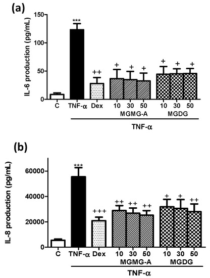 TNF-α-stimulated HaCaT cells manifested high IL-6 and IL-8 levels in comparison with unstimulated control cells (p < 0.001) (Figure 1). Pre-treatment with the reference compound dexamethasone (Dex) as well as MGMG-A (10, 30, and 50 µM) and MGDG fraction (10, 30, and 50 µg/mL) significantly inhibited IL-6 and IL-8 production, with no significant differences between the different tested concentrations.