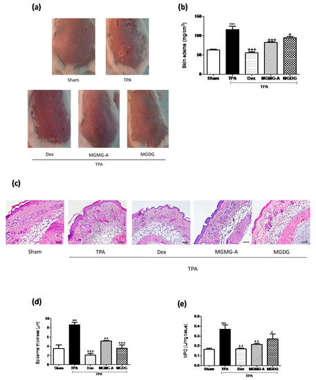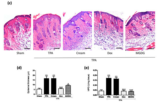 We studied the effect of MGMG-A and MGDG on the murine TPA-induced epidermal hyperplasia model, which reproduces certain biochemical and histopathological parameters typical of human psoriasis [11]. TPA administration to mouse skin resulted in the development of macroscopic lesions (Figure 2a) and skin edema, confirmed by a higher weight of the 1 cm2 punch biopsies compared with the sham group (p < 0.001) (Figure 2b). Topical treatment with Dex (200 µM), MGMG-A and MGDG (200 µM or 200 µg/mL, respectively) 30 min prior to TPA application inhibited macroscopic damage and the skin punch weight (p < 0.001 and p < 0.05, respectively), suggesting an inhibition of skin edema (Figure 2b). We next examined hematoxylin- and eosin-stained sections of mouse skin (Figure 2c). Consistent with macroscopic changes, TPA-treated animals exhibited a clear evidence of edema, epidermal hyperplasia, and massive neutrophilic infiltration compared with the sham (Figure 2c). Moreover, a marked increase in epidermal thickness was evident in the TPA group (p < 0.001) (Figure 2d). These results correlated with increased MPO activity, an established marker for inflammatory cell infiltration into the skin (Figure 2e). Treatment with the pure compound and glycolipid fraction markedly prevented epidermal hyperplasia (p < 0.01 and p < 0.001, respectively) (Figure 2c,d), which was associated with a reduction in MPO activity, being significant for MGMG-A (p < 0.01) (Figure 2e).