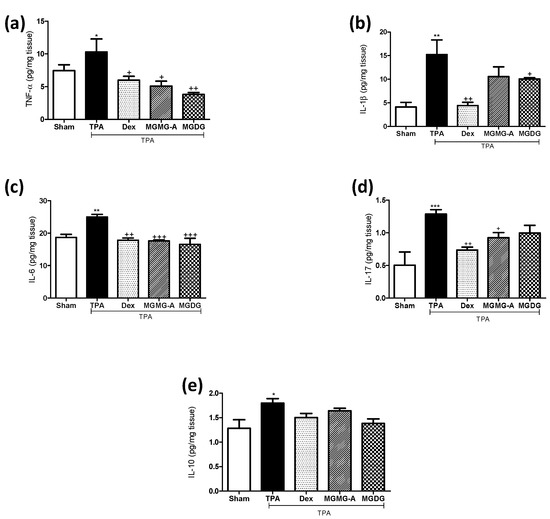 To support the beneficial effects of glycolipids on skin inflammation, we analyzed the production of several pro-inflammatory cytokines that are highly involved in psoriasis as well as the anti-inflammatory cytokine IL-10. Immune cell infiltration detected in the histological examination of the skin from TPA-treated mice correlated with increased levels of the pro-inflammatory cytokines TNF-α, IL-1β, IL-6 and IL-17, in comparison with the sham group (p < 0.05, p < 0.01, p < 0.01, and p < 0.001, respectively) (Figure 3). In accordance with the reduction of the skin edema, the production of TNF-α, IL-6, and IL-17 was significantly reduced in animals treated with the glycolipid MGMG-A (p < 0.05, p < 0.001, p < 0.05, respectively) (Figure 3a–d). Regarding the fraction MGDG, its application resulted in a strong significant suppression of TNF-α and IL-6 levels (p < 0.01, and p < 0.001) comparable to Dex (Figure 3a,c). IL-10 production analysis revealed increased levels in the TPA group when compared with the sham (p < 0.05). Nevertheless, pre-treatments showed lower IL-10 levels when compared to the TPA group, reflecting similar values to the sham (Figure 3e).