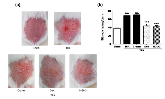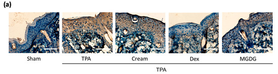 2.5. Topical Pre-Treatment with MGDG-Cream Decreases Skin Inflammation and Hyperplasia in the Murine TPA-Induced Model