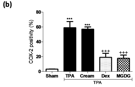It has been shown that topical application of TPA activates intracellular transduction signals, enhancing aberrant expression of COX-2 in mouse skin [38,39]. To further elucidate the mechanisms for the anti-inflammatory role of MGDG-cream in damaged skin, we detected this protein expression by immunohistochemistry. The results evidenced that pre-treatment with MGDG-cream markedly attenuated COX-2 expression in TPA-stimulated mouse skin, reaching similar levels to Dex-cream. Furthermore, this effect was confirmed in TNF-α-stimulated HaCaT human keratinocytes pre-treated with different concentrations of MGDG, showing that this glycolipid fraction reduced COX-2 levels at 50 µg/mL (data not shown). These findings at least partly suggest that suppression of COX-2 expression may be involved in the preventive effect of this glycolipid fraction on TPA-induced epidermal hyperplasia.