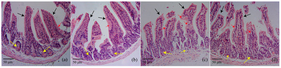 Histopathology of mice jejunum showing intestinal villi (black arrow), crypt regions (yellow arrow), and goblet cells (red arrow) from (a) female normal control, CK(F); (b) male normal control, CK(M); (c) HAHp(3.0)/ZnO NPs administered female mice; and (d) HAHp(3.0)/ZnO NPs administered male mice. HE stain at the initial magnification 200×.
