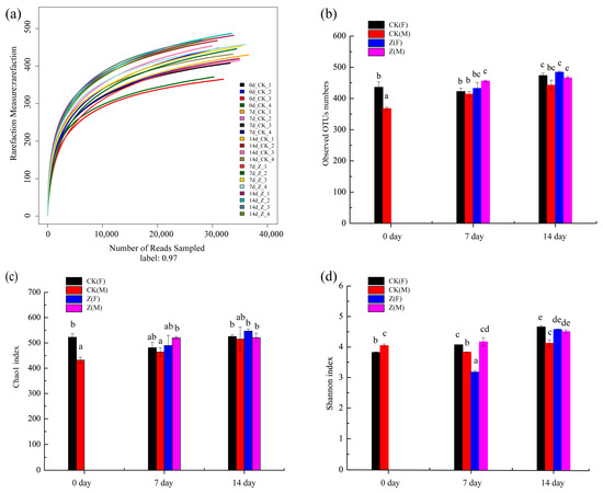 Similar to the results shown in Figure 2b, the CK groups showed significant differences in the Chao1 indices between the female and male specimens at 0 day (p < 0.05), and consistent tendencies with the results shown in Figure 2b were observed at 7 day and 14 day (Figure 2c). A greater Shannon index indicates a greater diversity of intestinal microbiota [36]. The Shannon indices of all of the specimens changed with the feed time. The Shannon index of Z(M) at 7 day was 4.17 ± 0.14 and it increased to 4.51 ± 0.05 at 14 day. In comparison, the Shannon index of Z(F) was dramatically increased from 3.18 ± 0.05 at 7 day to 4.58 ± 0.02 at 14 day (p < 0.05) (Figure 2d).