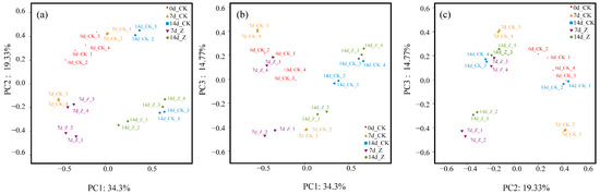 PCoA distribution of the normal control (CK) and HAHp(3.0)/ZnO NPs treated (Z) specimens at 0 day, 7 day, and 14 day. Numbers 1 and 2 represent female (F) specimens and numbers 3 and 4 represent male (M) specimens. (a) The scatter of PC1 and PC2; (b) the scatter of PC1 and PC3, and (c) the scatter of PC2 and PC3.