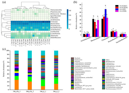 A total of 15 intestinal microflora were identified at the phylum level in the specimens (Figure 4a), of which the phyla Firmicutes, Bacteroidetes, Proteobacteria, Saccharibacteria, and Actinobacteria were most abundant, accounting for >97% of the total sequences. The other phyla had comparatively small numbers. The relative abundance of the five dominant phyla at 14 day was compared between the CK and Z groups (Figure 4b). Obviously, Firmicutes and Bacteroidetes were the two most dominant phyla in the specimens. At 14 day, the relative abundance of phylum Firmicutes were 42.89 ± 5.85% for 14 day of CK(F)(14 d CK(F)), 48.40 ± 1.83% for 14 day of CK(M) (14 d CK(M)), and 45.35 ± 5.89% for 14 day of Z(M) (14 d Z(M)). However, the relative abundance of phylum Firmicutes in 14 day of Z(F) (14 d Z(F)) was 68.32 ± 5.98%, dramatically higher than other specimens (p < 0.05). In contrast, a markedly decreased relative abundance of phylum Bacteroidetes (16.98 ± 5.63%) was found in 14 d Z(F) (p < 0.05).