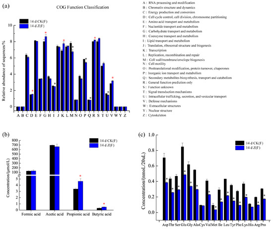 Comparison of function prediction, short-chain fatty acids (SCFAs) and amino acid concentrations in feces of female mice between 14 d CK(F) and 14 d Z(F). (a) Function prediction using Clusters of Orthologous Groups of proteins (COG) orthology; (b) SCFAs concentration; (c) amino acid concentrations of aspatic acid (Asp), threonine (Thr), serine (Ser), glutamic acid (Glu), glycine (Gly), alanine (Ala), cysteine (Cys), valine (Val), methionine (Met), isoleucine (Ile), leucine (Leu), tyrosine (Tyr), phenylalanine (Phe), lysine (Lys), histidine (His), arginine (Arg), and proline (Pro). An asterisk represents a significant difference between 14 d CK(F) and 14 d Z(F) in relative abundances or SCFAs, and amino acid concentrations (p < 0.05). The red and black asterisks in (a) represent significantly decreased and increased relative abundances, respectively. The red asterisks in (b) indicate significantly increased SCFAs concentrations. The black asterisks in (c) indicate significantly decreased amino acid concentrations.