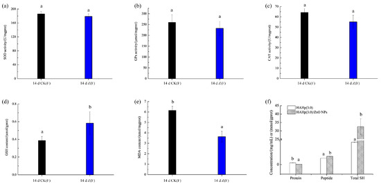 Comparison of liver oxidative status between 14 d CK(F) and 14 d Z(F) after 14 days of oral gavage at a dose of 1.0 g/kg body weight. (a) Total activity of superoxidase dismutase (SOD); (b) activity of glutathione peroxidase (GPx); (c) activity of catalase (CAT); (d) glutathione (GSH) stock content; (e) malonaldehyde (MDA) content. In (a–e), each group contained five animals. Different lowercase letters indicate significant differences compared between 14 d CK(F) and 14 d Z(F) (p < 0.05). (f) Concentrations of protein, peptide and total sulfhydryl (SH). Different lowercase letters in protein, peptide and total SH indicate significant differences compared between HAHp(3.0) and HAHp(3.0)/ZnO NPs (p < 0.05).