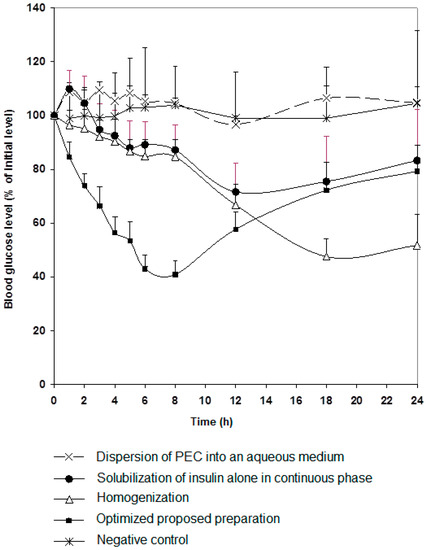 Continuous phase: to prepare the oily phase; 20 wt % non-ionic surfactants Labrasol (polyethylene glycol caprilic/capric glycerides) and Plurol Oleique (polyglecyryl-6-dioleate) at a weight ratio of (1:1) were suspended in 80 wt % of oleic acid. Insulin nanoparticles were obtained by dropping 500 µL of the PEC into 25 g of the oily phase and vortexing for 30 s at 25 °C. (6.6–7.1 IU) of insulin was delivered per mL of the formula (equivalent to 0.23–0.25 mg/mL). Control preparations involved modifying one or more of the parameters described above, and these include: (1) dispersion of the PEC into an aqueous medium; (2) Exclusion of chitosan from the PEC; (3) Addition of a final homogenization step (500 bars, 5 cycles) using a high pressure homogenizer (Emulsiflex-C5, Avestin Inc., Ottawa, ON, Canada) with cooling coil circulation for stability at a temperature not exceeding 35 °C; (4) negative control.