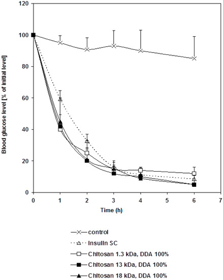 Fasted STZ-diabetic rats were divided into 3 groups, each consisting of 10 rats; first group was injected with 1 IU/kg of insulin, second group was injected with chitosan-insulin with complexes equivalent of 1 IU/kg of insulin, whereas, third group was used as a negative control group.
