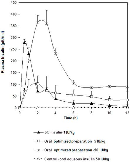 Insulin plasma levels profile after a single oral administration of the optimized preparation in doses of 5 and 50 IU/kg to fasted STZ diabetic rats compared to subcutaneous injection of free insulin (1 IU/Kg) and oral free insulin aqueous solution (50 IU/kg) as a control. Results are expressed as average of three independent experiments (n = 18).