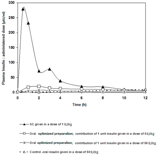 With that being said, the following could be noted from our plasma insulin profile: Cmax of the 50 IU/kg dose was approximately 3.5 fold higher than that of the 5 IU/kg dose. Both oral doses showed Tmax at 2 h, whereas the subcutaneous dose reached maximum concentration after 30 min. AUC were calculated and, as expected, that of the 50 IU/kg dose was higher, practically double, the 5 IU/kg dose (Table 4).